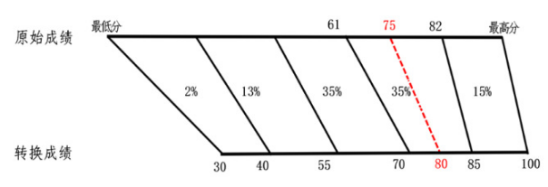 1、將每個(gè)選考科目的考生群體原始分從高到低排序,劃分為A、B、C、D、E五個(gè)等級。各等級人數(shù)所占比例通常為A等級15%、B等級35%、C等級35%、D等級13%、E等級2%。